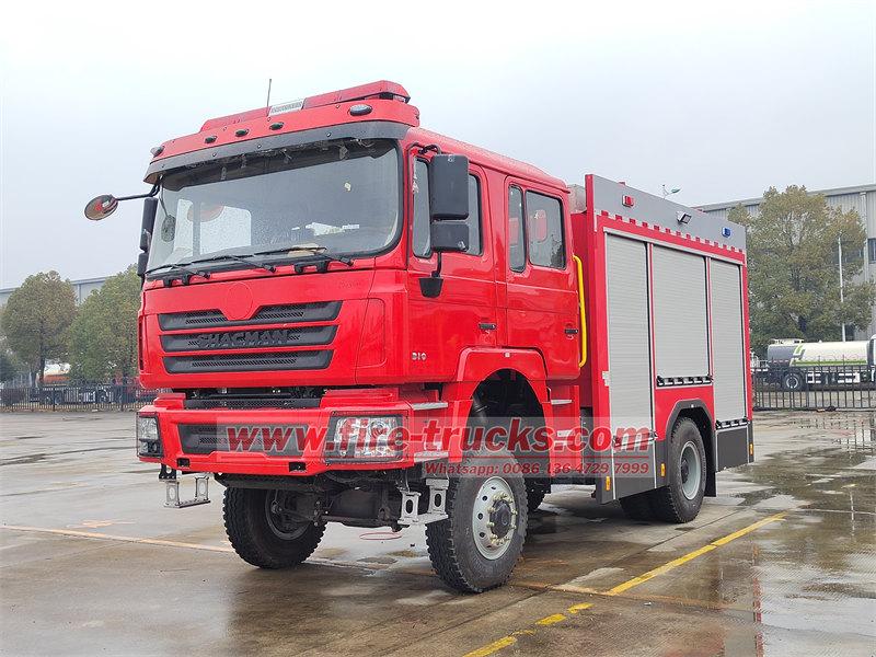 tanker material PP, 4X4, 6X6 drive, RHD drive is optionalPOWERSTAR 4×4越野消防车 陕汽 是一款专为消防救援任务设计的高性能车型,由POWERSTAR TRUCKS设计和制造。它基于SHACMAN 4×4越野底盘,配备全地形轮胎,能够快速应对复杂地形,为消防救援行动提供强大的技术支持。 Shacman全轮驱动消防车 主要配置:6000L水箱、CB10/60消防泵、PS8/60W消防炮及相关消防器材。该消防车以水为主要灭火剂,通过消防水带和消防炮喷射水流,射程可达70米,适用于扑灭一般固体物质火灾。