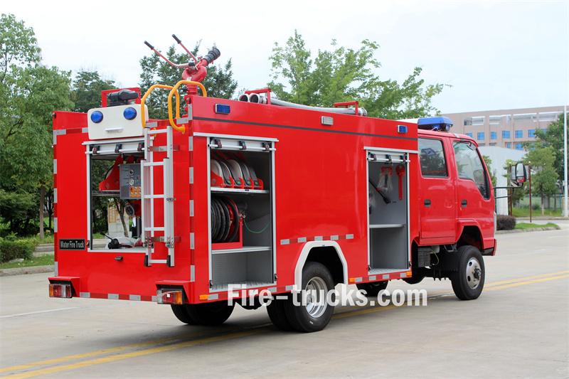 这辆五十铃3立方米水罐消防车基于五十铃100P 4x4双排座底盘打造,轴距为3360毫米。它搭载五十铃4KB1-TCG60发动机和MSB 5速变速箱。车身前部为设备舱,中部装有300升碳钢水箱,后部为泵房,配备CB10/60-XZ消防泵、控制面板、消防水带、消防器材等。车顶还安装了PS8/30W消防炮。