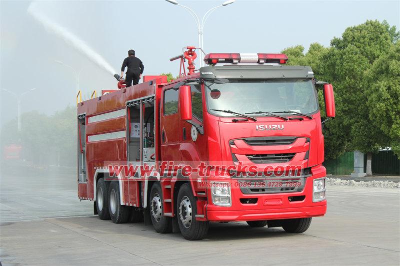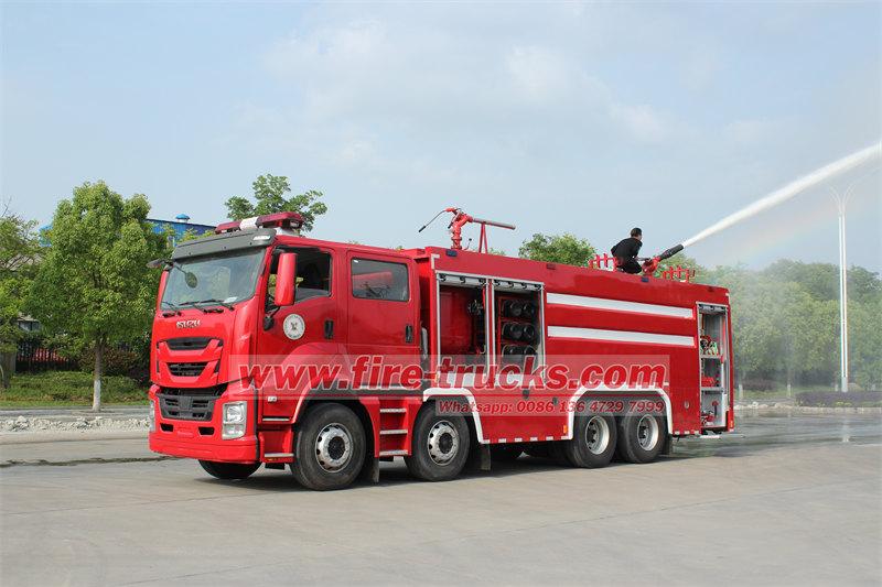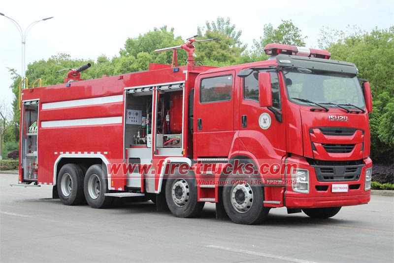 tanker material PP, 4X4, 6X6 drive, RHD drivePOWERSTAR干粉泡沫消防车 是一款集水、泡沫和干粉灭火功能于一体的专用消防车,能够高效应对各种火灾场景。该消防车基于五十铃GIGA 8×4底盘,尺寸为11,995 x 2,550 x 3,800毫米,采用消防车红色涂装,标准座位数为6座。 五十铃GIGA粉末消防车 配备12000L水箱、2000L泡沫罐和1000kg干粉系统,可快速切换不同灭火剂。相比传统水/泡沫消防车,该车型增加了干粉系统,包括一门PF40干粉炮,喷洒速度≥40kg/s,可快速灭火并防止复燃。