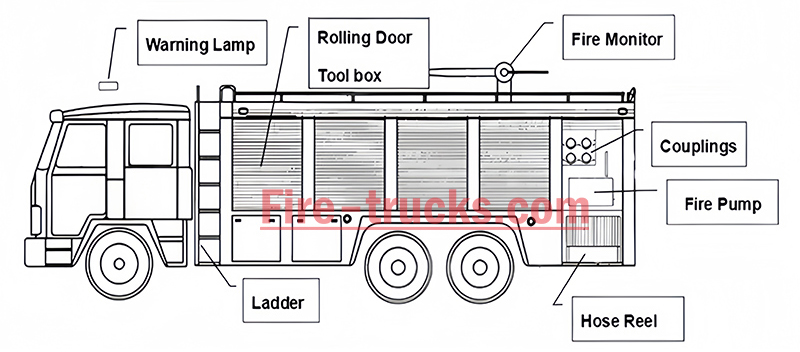 后部泵房内安装了一台额定流量为 30 升/秒、压力为 1.0 兆帕的 CB10/30-RS 型消防泵。该泵性能可靠,可提供稳定的水压,确保消防水带能够有效地将水或泡沫远距离输送至灭火区域。